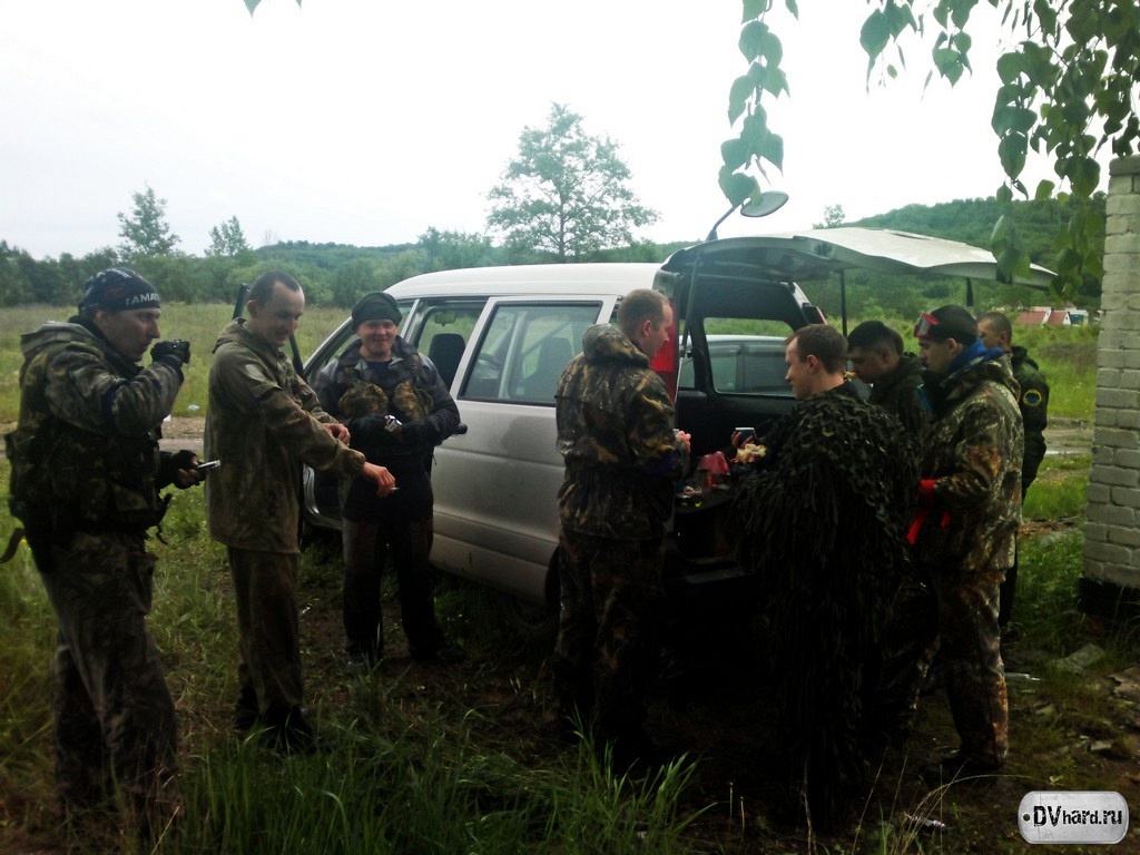 Но как то все поначалу не заладилось: «погода ппц((((» - дал утреннюю метеосводку HunteR. И, действительно, начавшийся по прогнозам синоптиков (угадали) ночью дождь явно не собирался прекращаться. Но ведь и мы явно не собирались прекращать хардбольные мероприятия, поэтому в 8-30 я был уже на месте сбора – «Поедимке». Здесь, мокрые и радостные, меня уже встречали Антон Vader, Jonny и Лешка. Все… пунктуальные люди на этом закончились. Благо оставались люди, поддерживающие хардбол в любую погоду – вскоре подтянулись HunteR, Грек, Стас, Ден, Паха и Lex. Ситуация для нынешнего хардбола в Благовещенске просто критическая: всего 10 человек – это неявка больше половины наших бойцов. Ну что же, остается понять и простить, видимо дела были у всех особой важности.