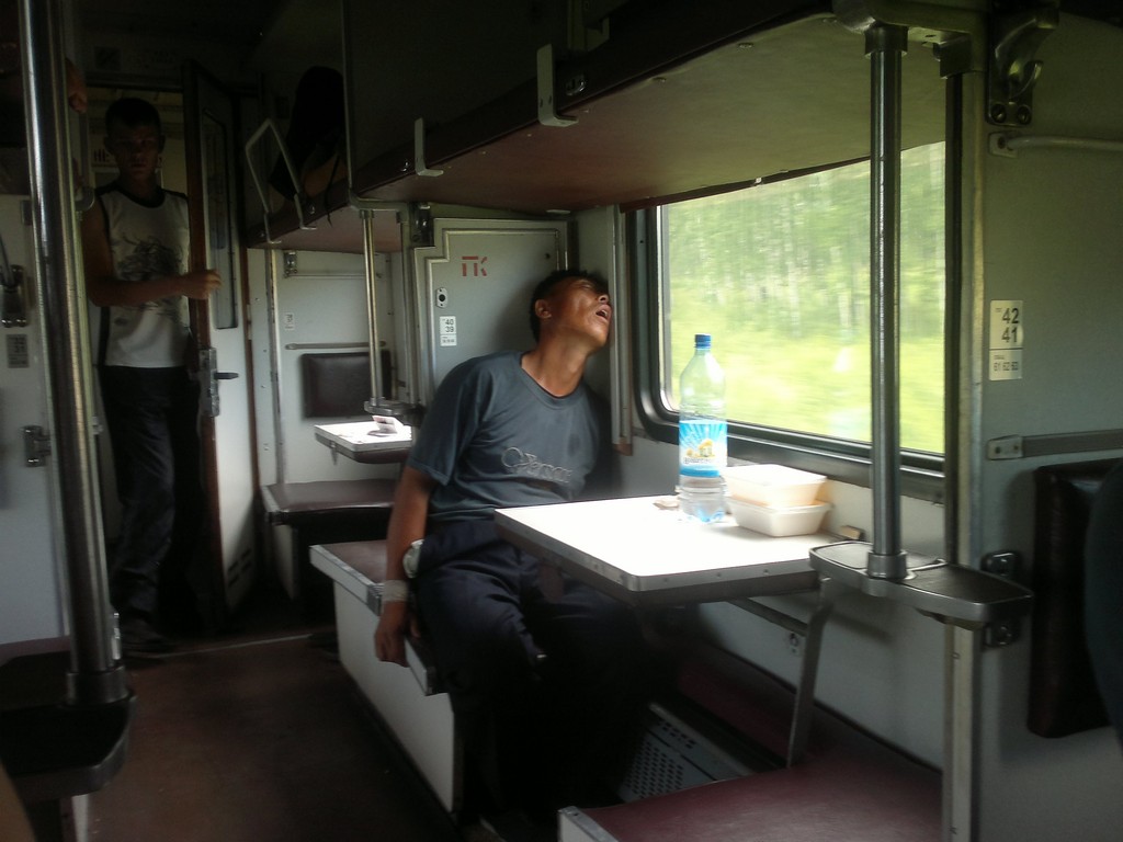 Многие большую часть дороги просто спят на верхних полках, тех же, кто засыпает в самых неудачных позициях, быстро рассматривают как очередную фотожертву. Под жертву даже попадали наши соседи-корейцы, которые все-таки смогли как-то ужиться с нами по соседству.