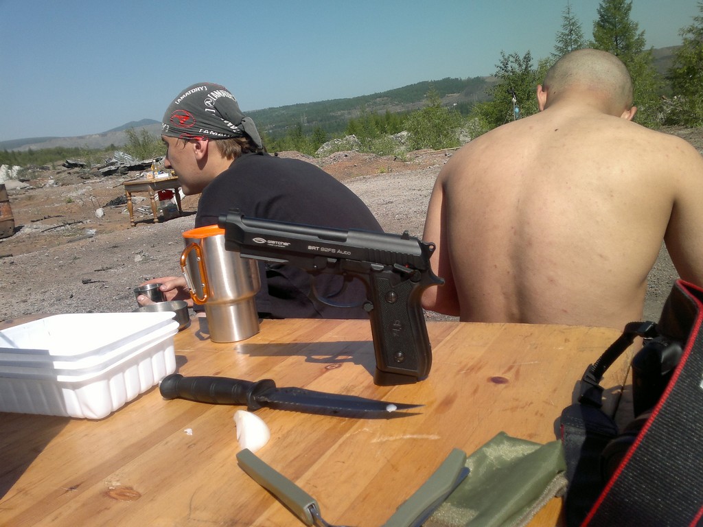 Что делают хардболисты сразу после боев? Правильно, идут пить воду, питаться и обсуждать взахлеб все произошедшее. Во время такого обсуждения за столом и произошло первое покушение на меня. Человек напротив (не будем показывать пальцем) сидел и изучал устройство беретты. Честно говоря, крутил очень подозрительно, но со знанием дела, поэтому мысль о случайном выстреле оставалась только в голове. Но раз в год стреляют и карандаши, и этот раз в год по ходу выпал именно на этот день. Пуля уходит в кружку, рикошетит от нее неприятно останавливается на моей руке. Все живы-здоровы, хардбольные обсуждения проходят в самой заряженной обстановке.