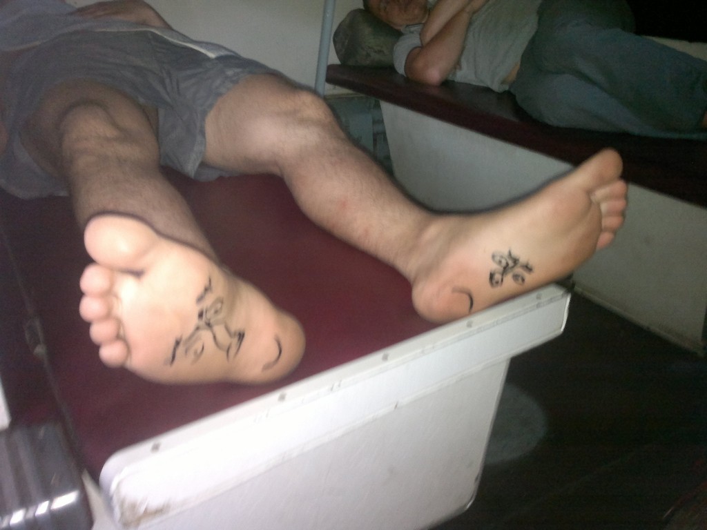 Одним из ведущих направлений поездовой поездки стала пяточная живопись маркером. Начал ее Басик, им же все и закончилось. Во время рисования мимо него пробегал пацан лет 6-8, пробежал и ехидно улыбнулся. Меньше чем через минуту он уже стоял с телефоном, готовясь запечатлеть рисунок, но в этот момент носитель творения почему-то свернул ноги. Дабы порадовать ребенка, выкладываю ту самую фотку с моего телефона.