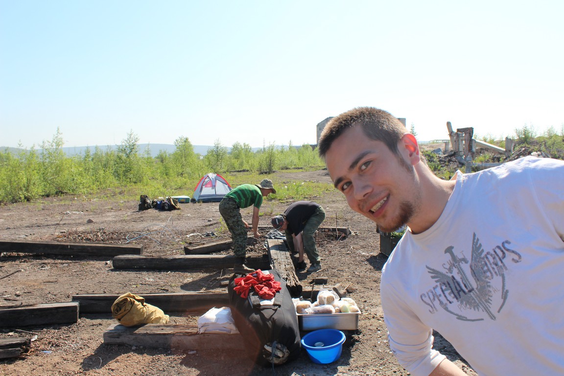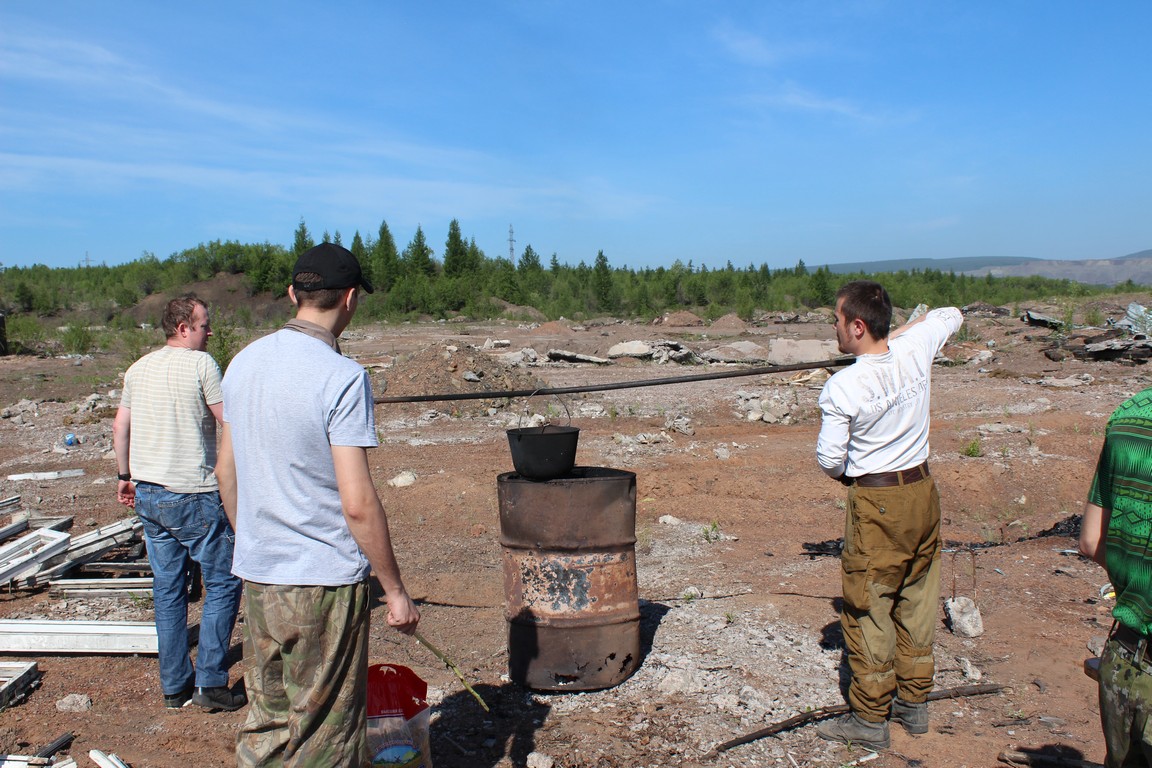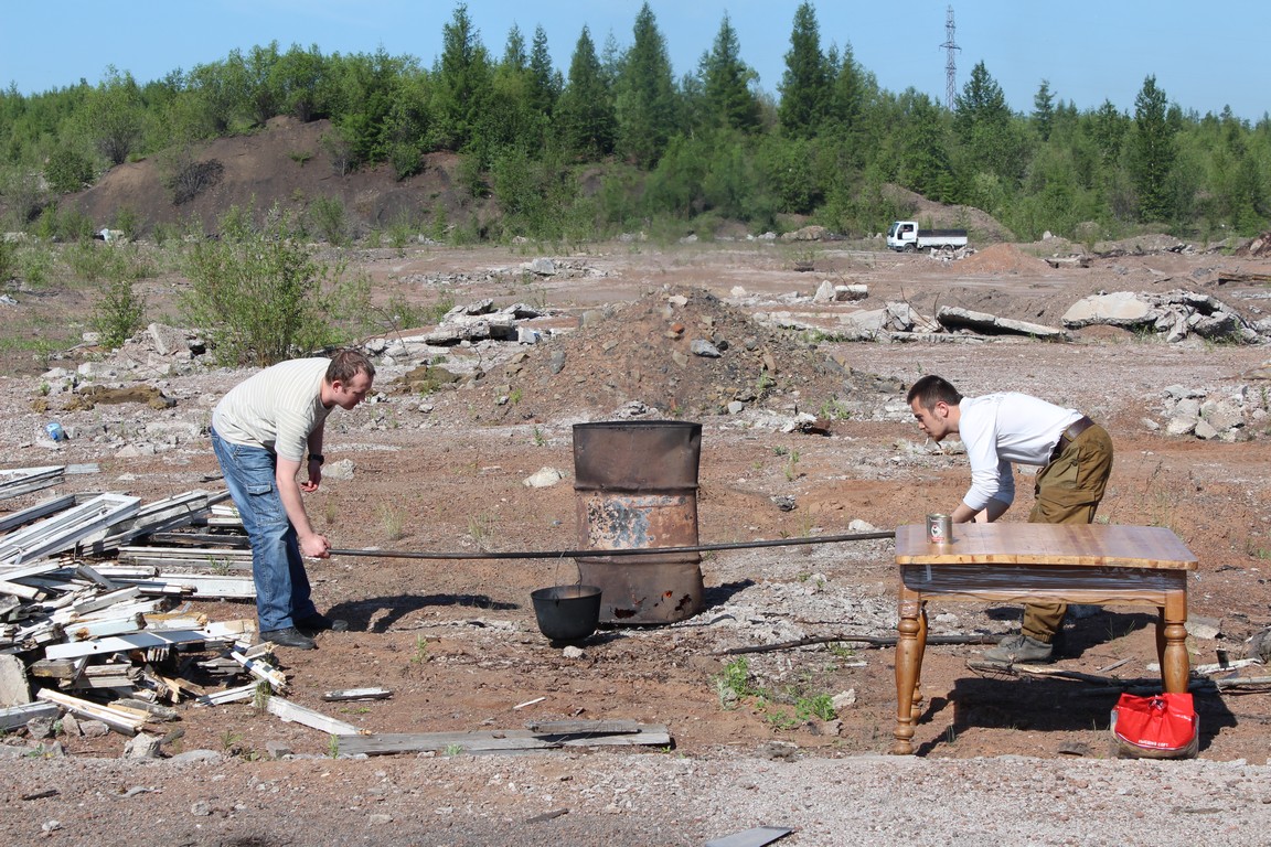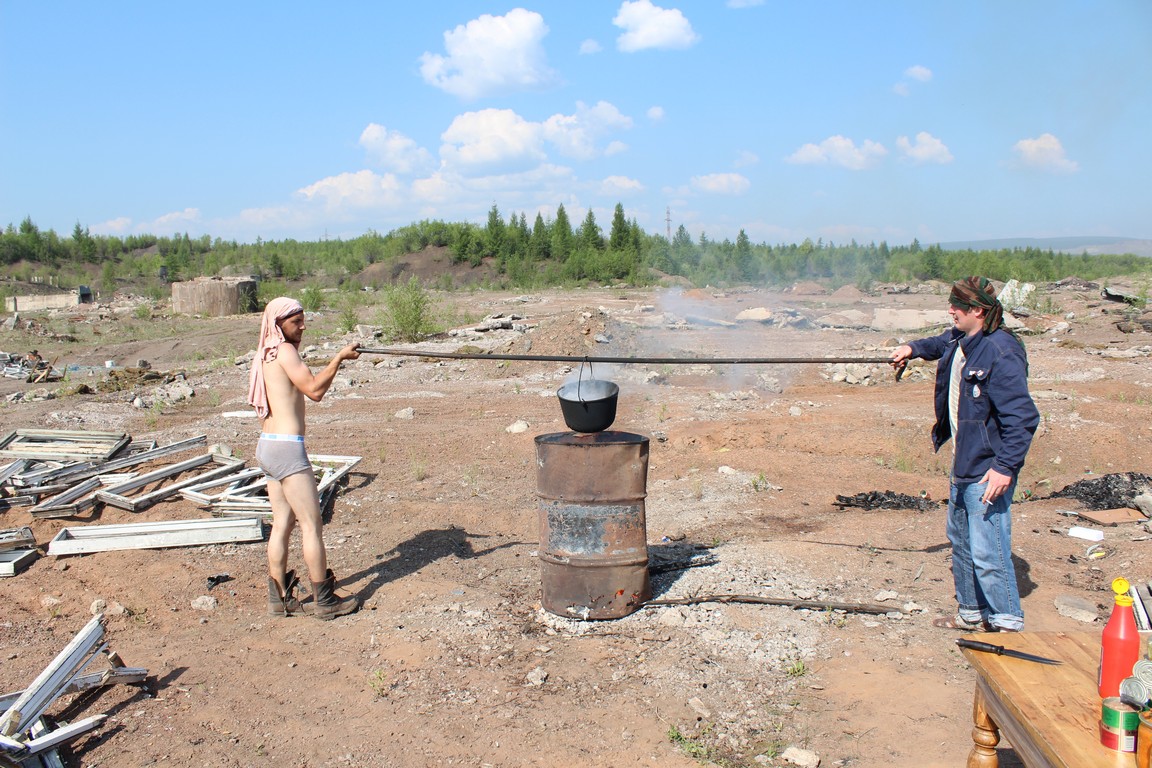 Первое, что удалось съесть на этой земле – лиственницу. По рекомендации Кирилла были выбраны самые «вкусные» и кислые оконечности, но желудок просил чего-то нашего. «Нашим» из подвезенных ресурсов были определены рожки с тушняком «по-сталкерски»: рожки и тушенка в масштабе 1-к-1 в котелки над костром исключительно из оконных рам с краской с добавлением гари и местной земли от наскоро сделанной палки-мешалки.