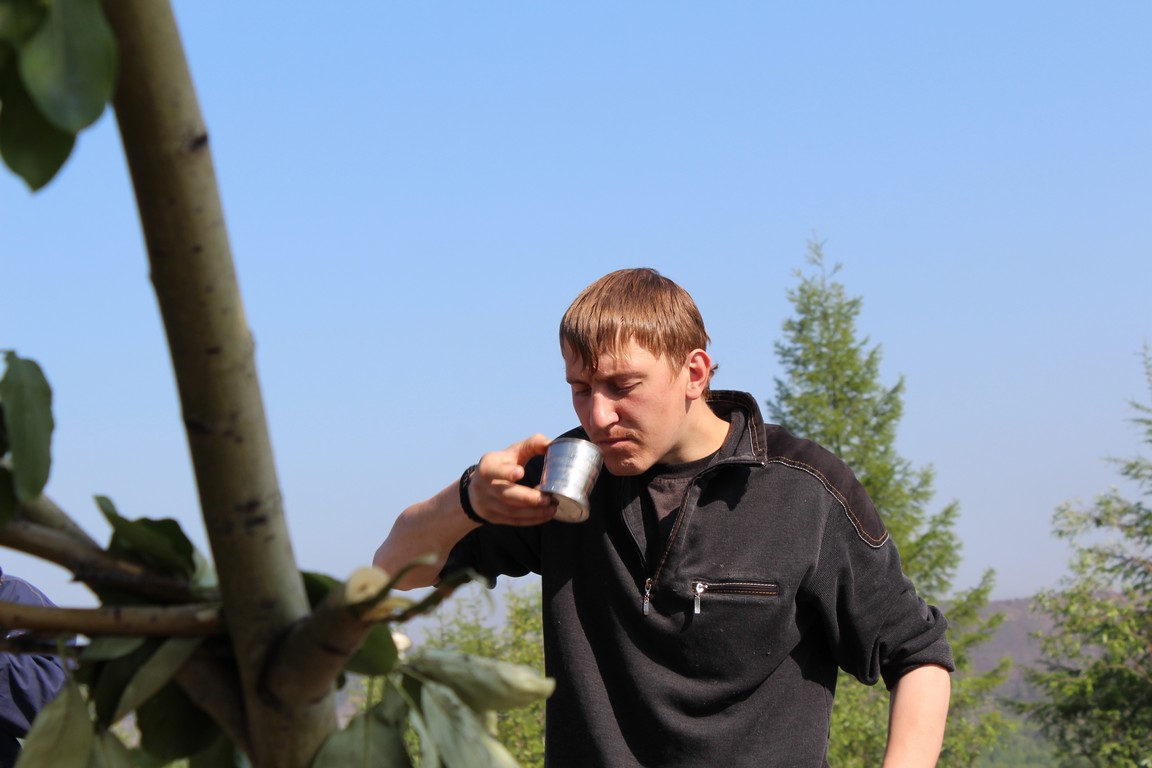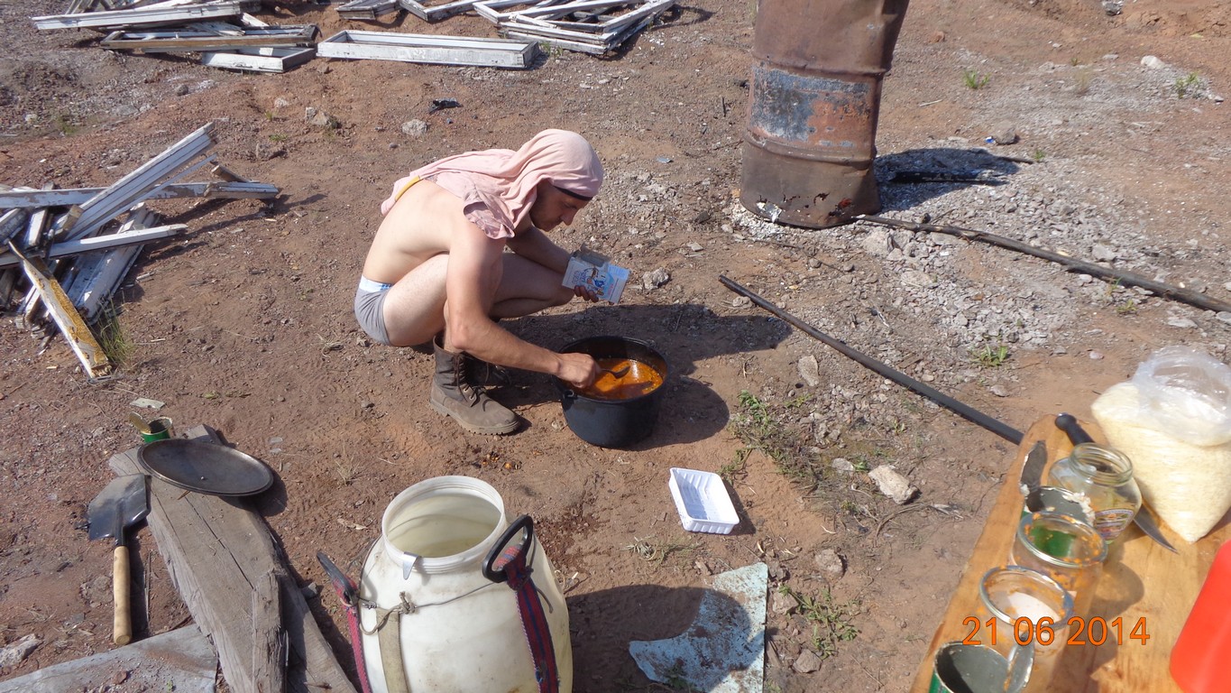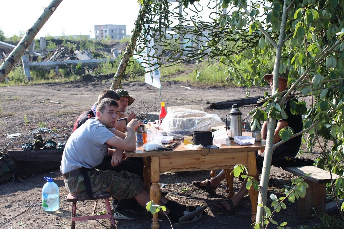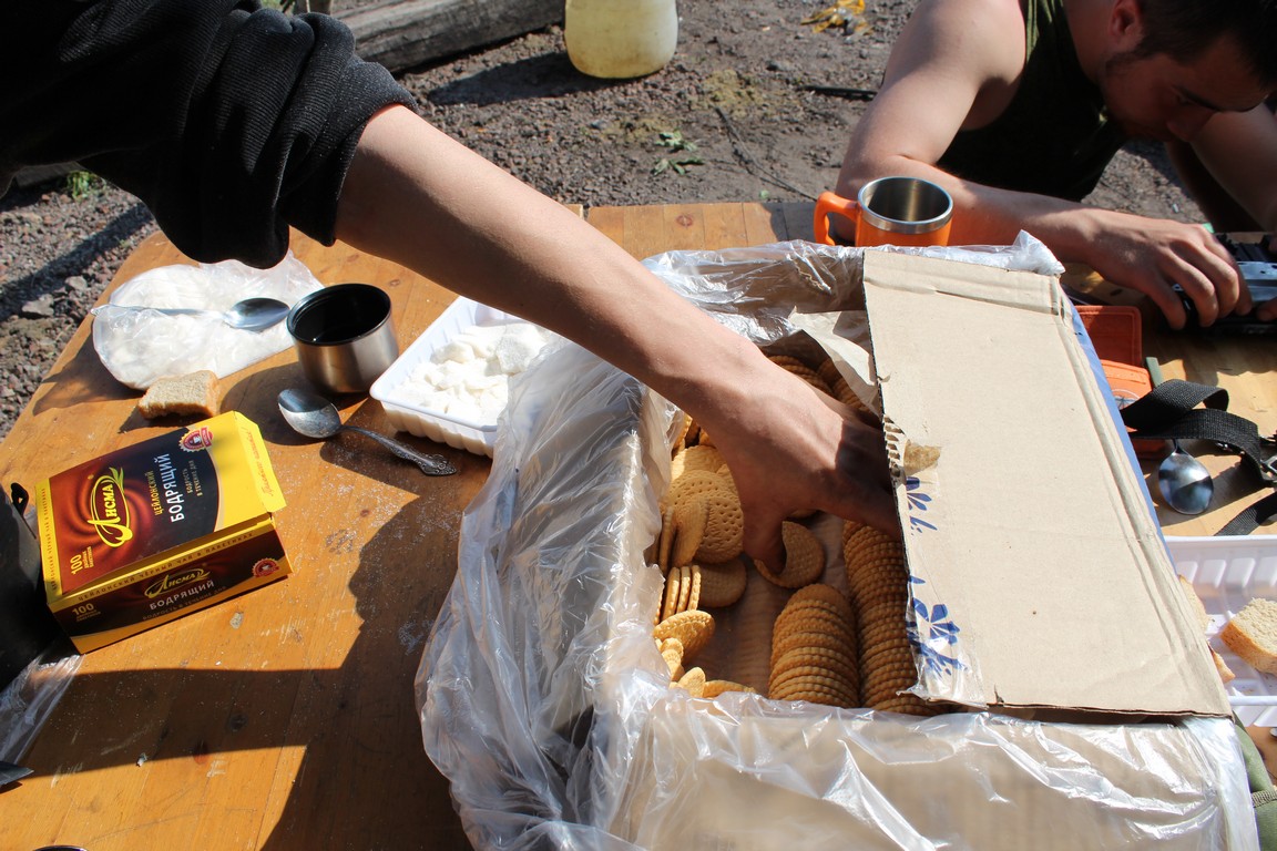 Первое, что удалось съесть на этой земле – лиственницу. По рекомендации Кирилла были выбраны самые «вкусные» и кислые оконечности, но желудок просил чего-то нашего. «Нашим» из подвезенных ресурсов были определены рожки с тушняком «по-сталкерски»: рожки и тушенка в масштабе 1-к-1 в котелки над костром исключительно из оконных рам с краской с добавлением гари и местной земли от наскоро сделанной палки-мешалки.