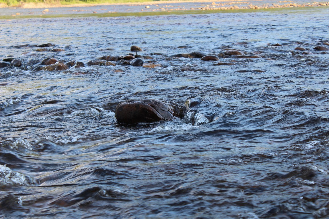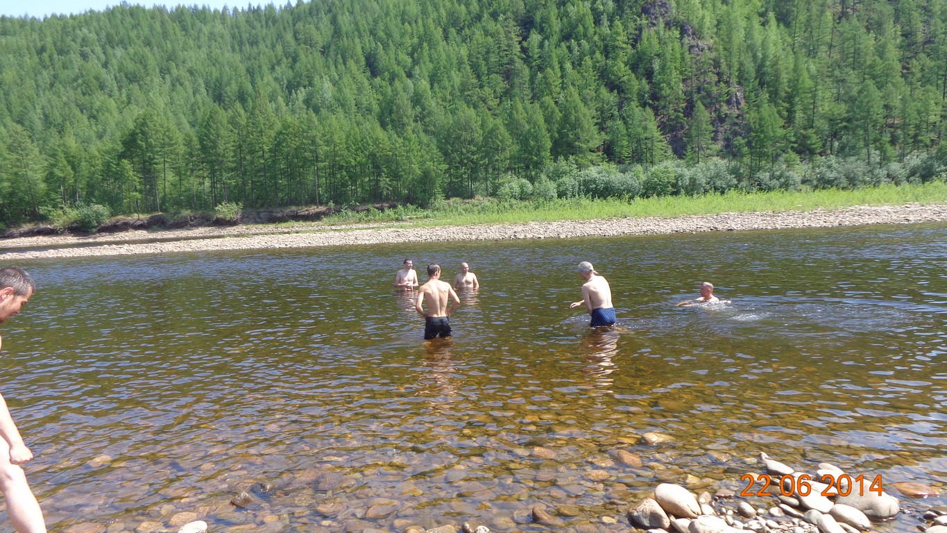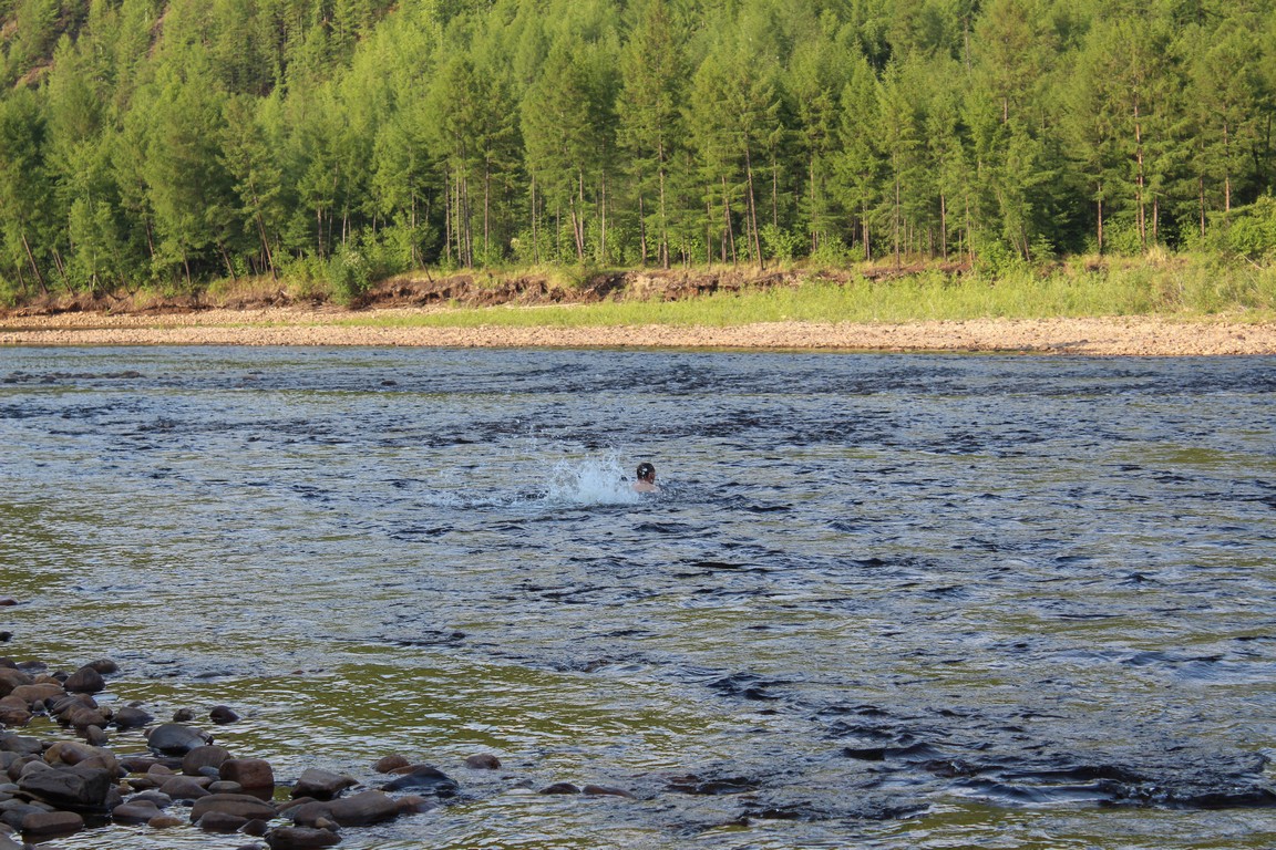 Река Чульман проходит через город и является местом массовых купаний жителей Нерюнгри. Ближе к мосту купается большая часть населения, чуть поодаль более одичалые нерюнгринцы, еще дальше купались хардболисты, а уж что происходит далее даже представить страшно – возможно именно там и обитают местные медведи. Дно у речки каменистое, заходить было удобно в тапочках, течение вполне уверенное, иногда может и снести. Воды примерно по пояс, а температура… пожалуй, это самое холодное, что было в Нерюнгри в эти дни.