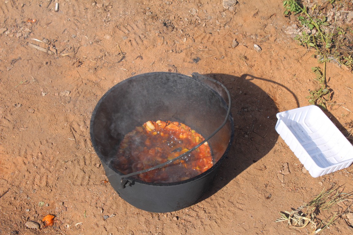 В лагере Мега к нашему приезду подогревает на полевой костерной микроволновке котел с едой, гудит генератор, перебивая жужжание местных кровопийц, день подходит к концу.